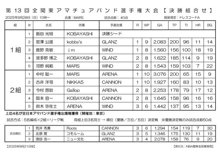 第13回 全関東アマチュアバンド選手権大会 予選結果と決勝組合わせです
