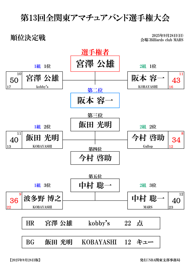 第75回 秋季 全関東アマチュアスリークッション三段戦 予選結果と決勝組合わせです