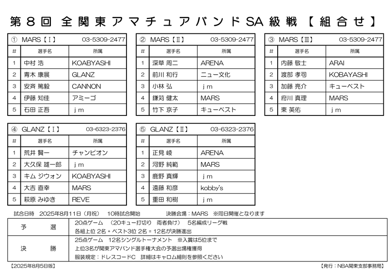 第8回 全関東アマチュアバンドSA級戦 予選組合わせです