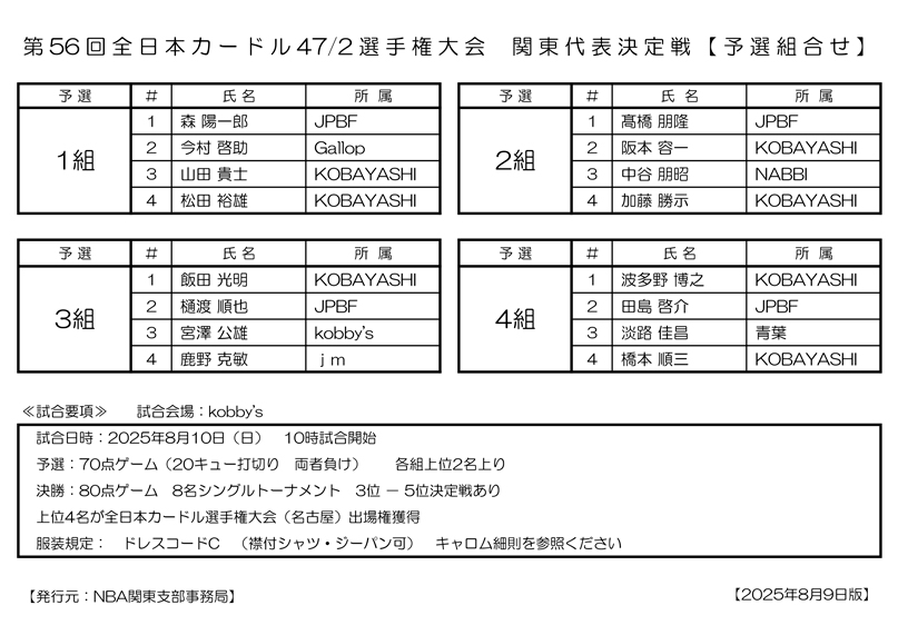 第56回 全日本カードル47/2選手権大会 関東代表決定戦 予選組合わせです