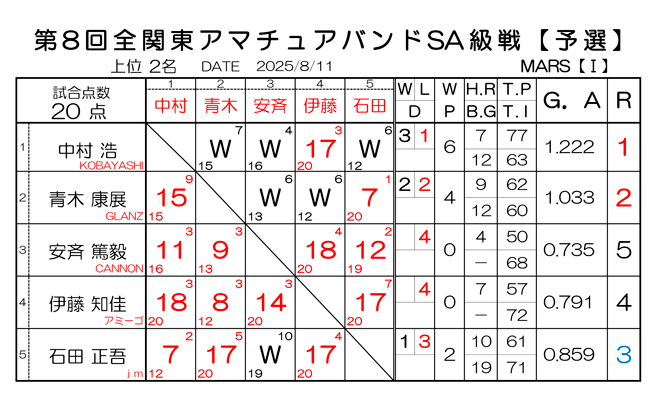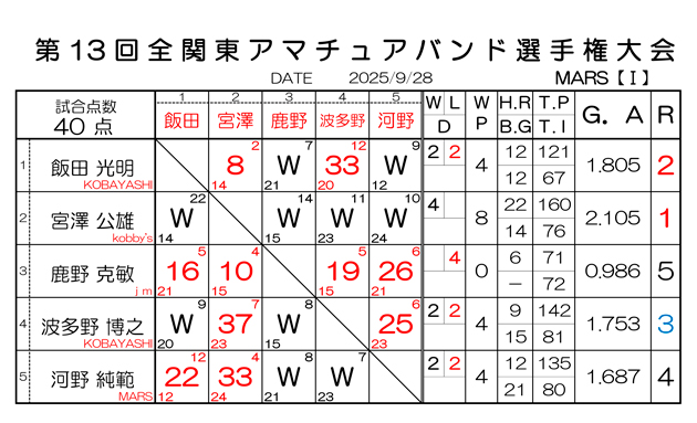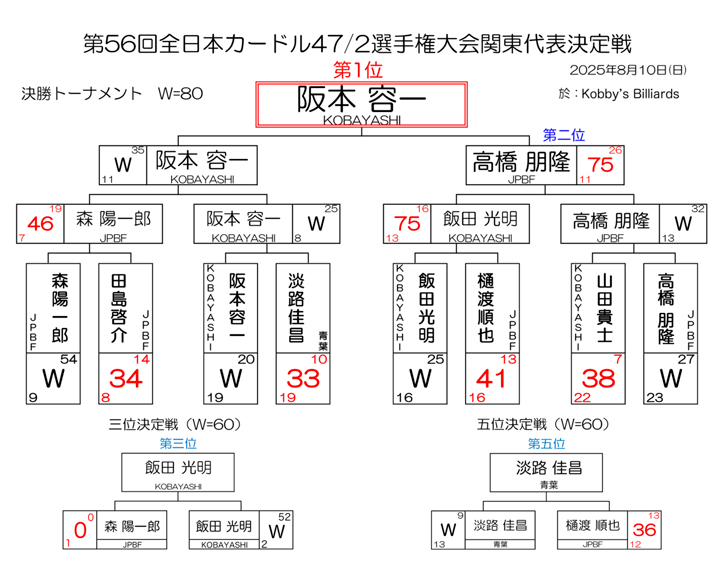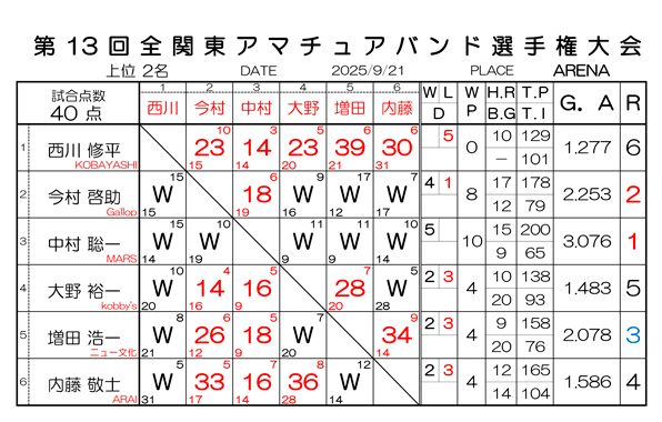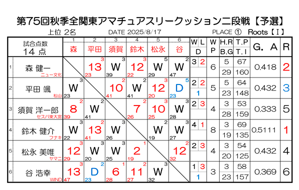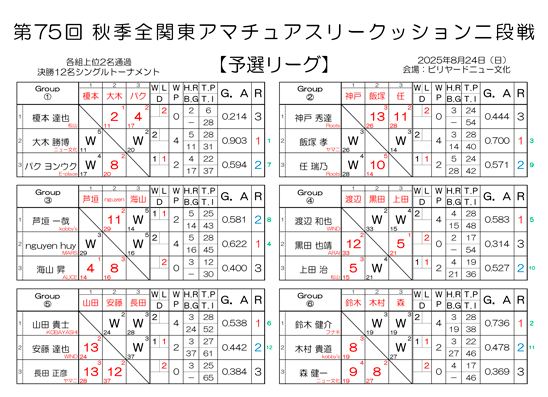 第75回 全関東アマチュアスリークッション二段戦 予選結果と決勝組合わせです