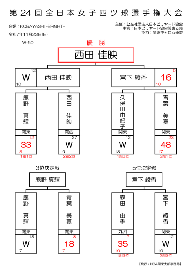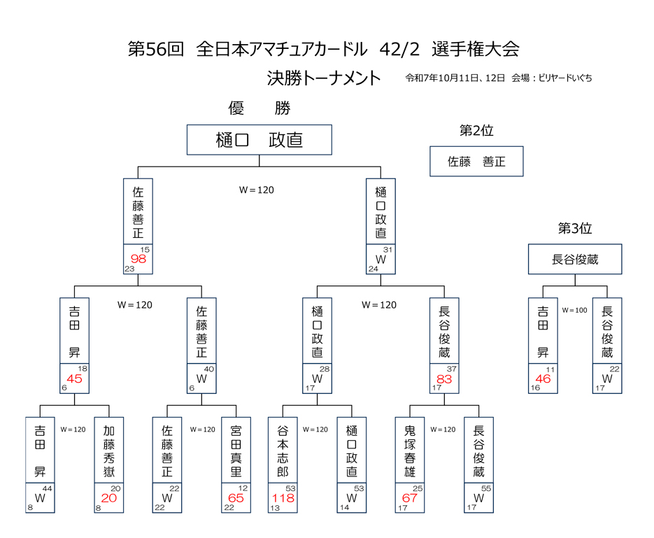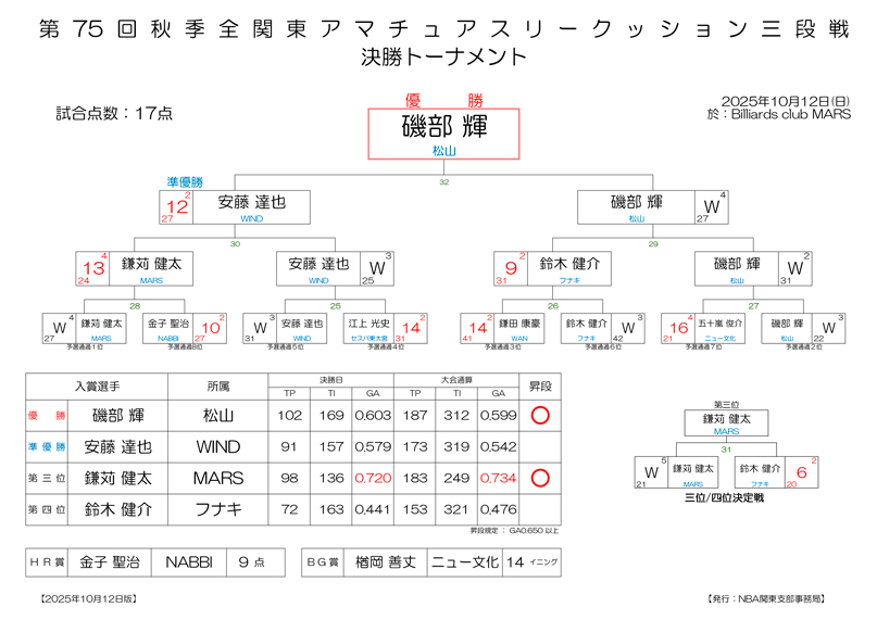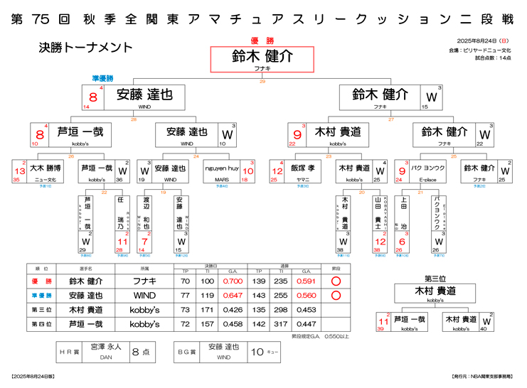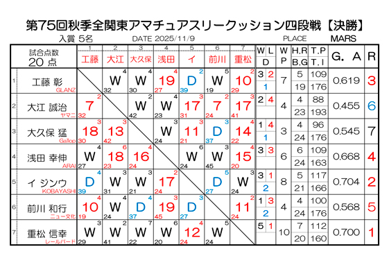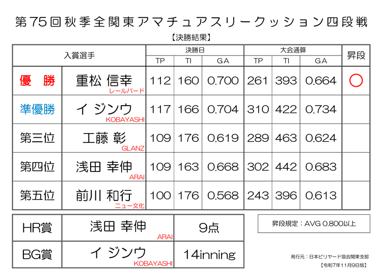 第75回 秋季 全関東アマチュアスリークッション四段戦 決勝 試合結果です