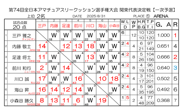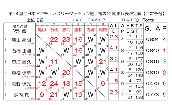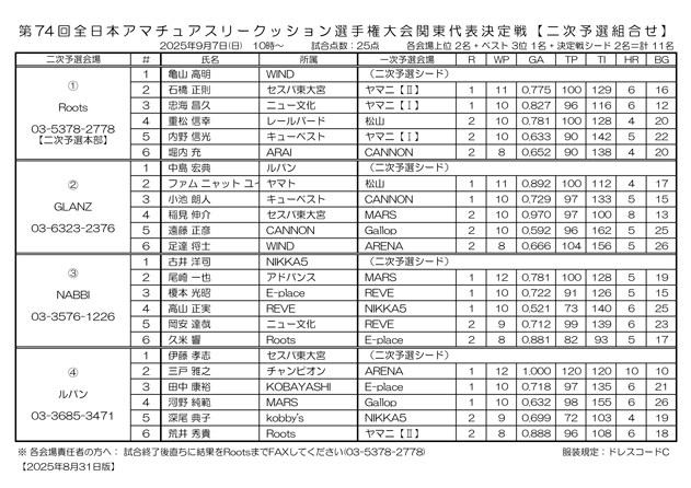 第74回 全日本アマチュアスリークッション選手権大会 関東代表決定戦 一次予選の結果と二次予選の組合せです