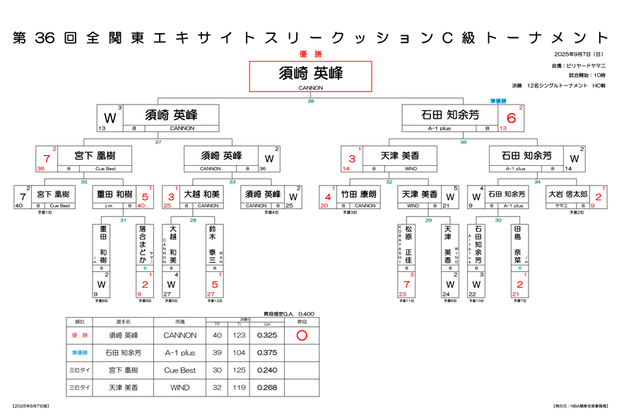 第36回 全関東エキサイトスリークッションC級トーナメント 試合結果です