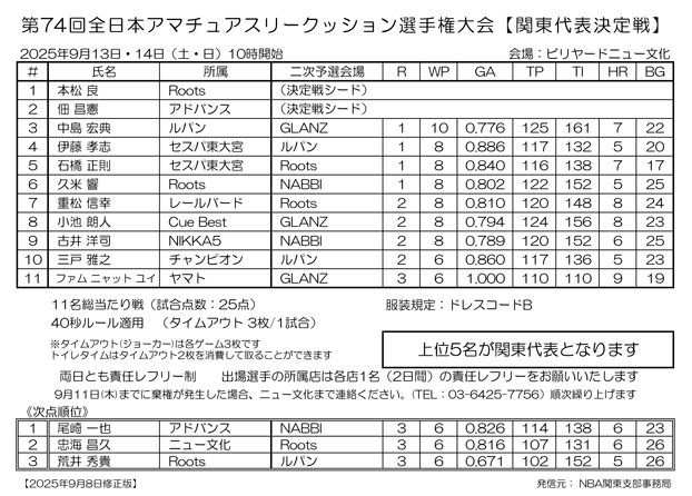 【修正2校】第74回 全日本アマチュアスリークッション選手権大会 関東代表決定戦 二次予選の結果と決定戦の組合せです