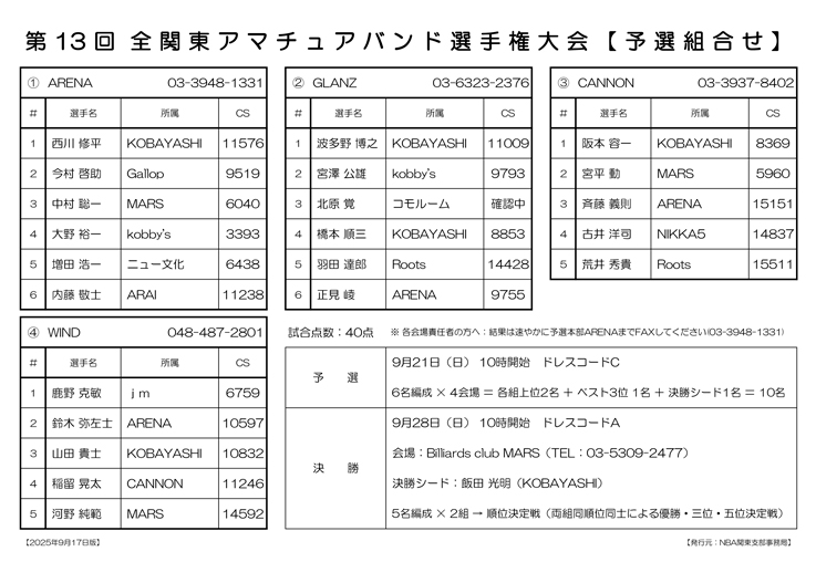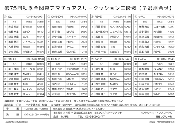 第75回 秋季 全関東アマチュアスリークッション三段戦 予選組合せです