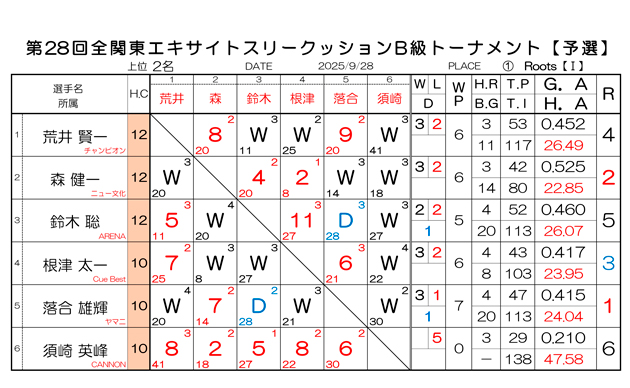 第28回 全関東エキサイトスリークッションB級トーナメント予選結果です