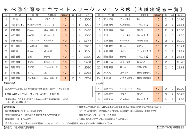 【確定版】第28回 全関東エキサイトスリークッションB級トーナメント決勝進出選手一覧です