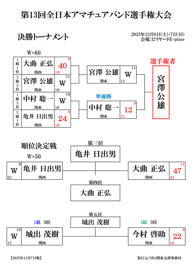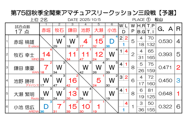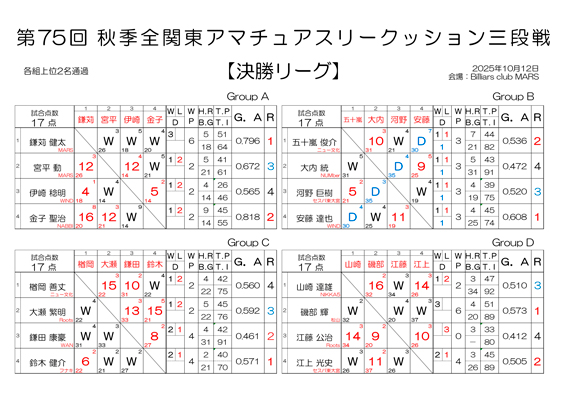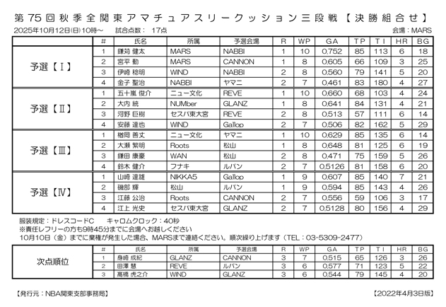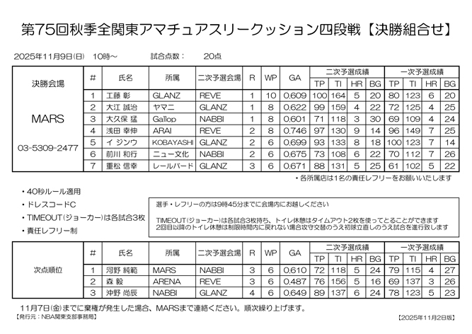 第75回 秋季 全関東アマチュアスリークッション三段戦 予選結果と決勝組合わせです