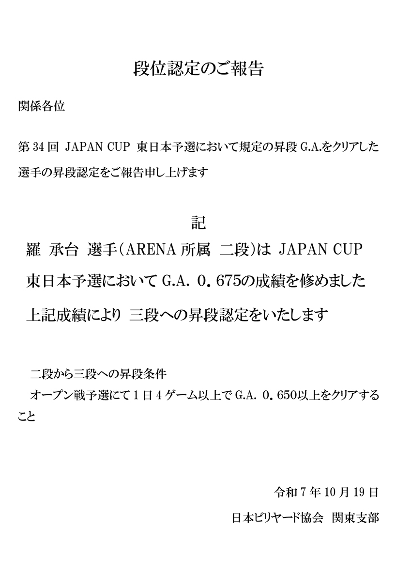 第75回 秋季 全関東アマチュアスリークッション三段戦 試合結果です