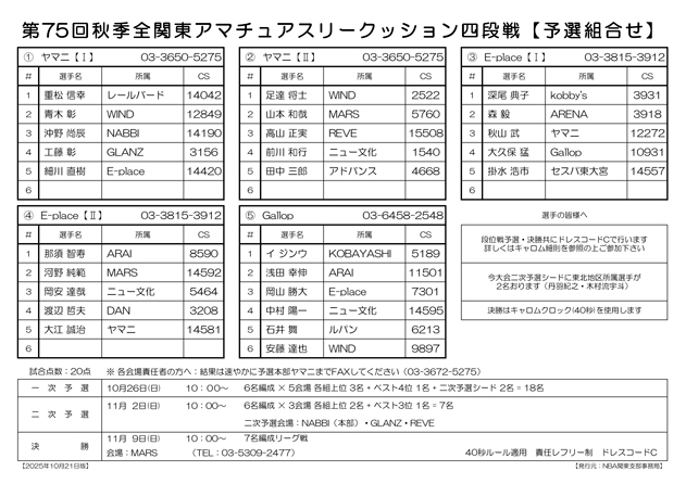 第75回 秋季 全関東アマチュアスリークッション四段戦 一次予選の組み合わせです