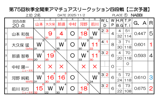 第75回 秋季 全関東アマチュアスリークッション四段戦 一次予選の結果と二次予選の組み合わせです