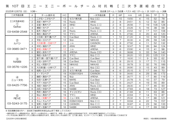 第107回エニーエニーボールチーム対抗戦 二次予選の結果と決勝進出チーム一覧です