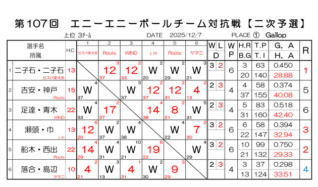第107回エニーエニーボールチーム対抗戦 一次予選の結果です