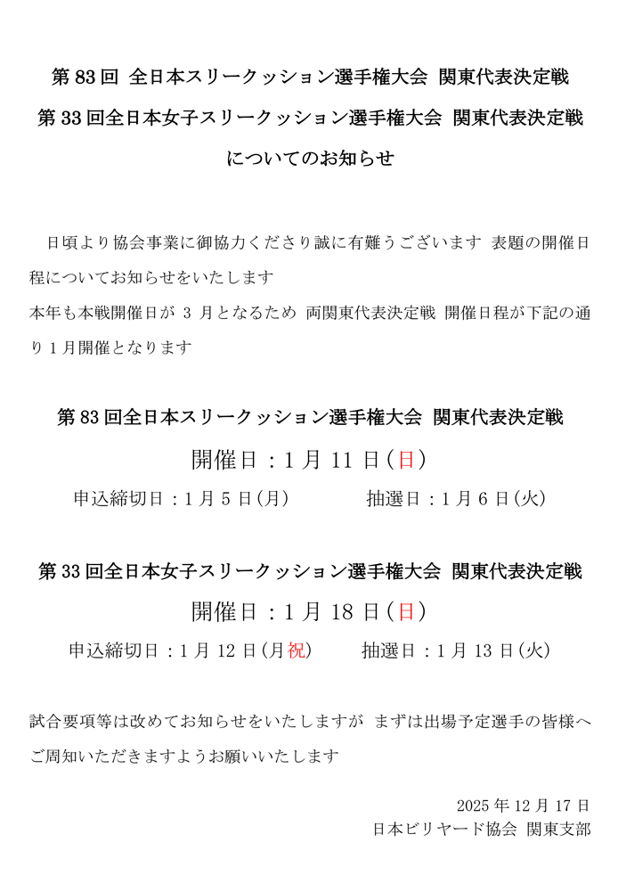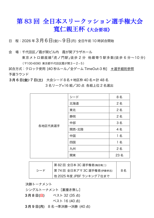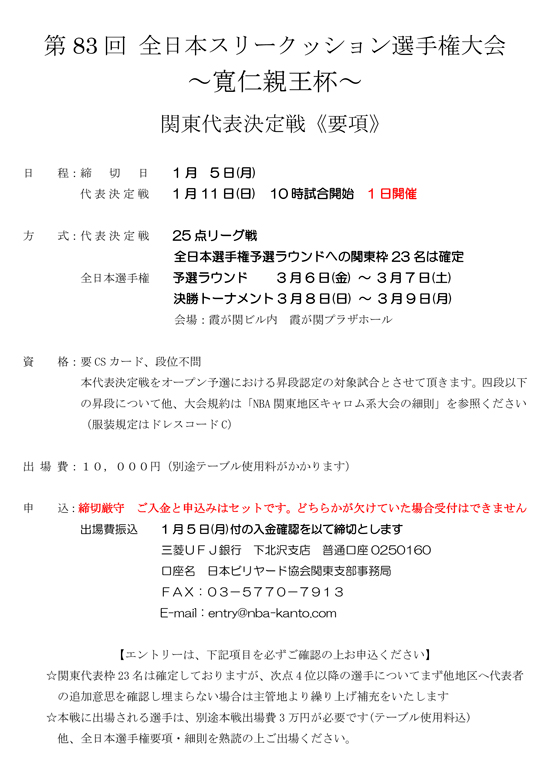第83回 全日本スリークッション選手権大会~寬仁親王杯~関東代表決定戦 要項および本戦要項です