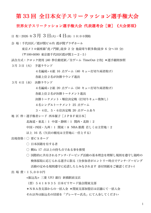 【修正2稿】第33回 全日本女子スリークッション選手権大会 世界女子スリークッション選手権大会 代表選考会[兼]関東代表決定戦要項および本戦要項です