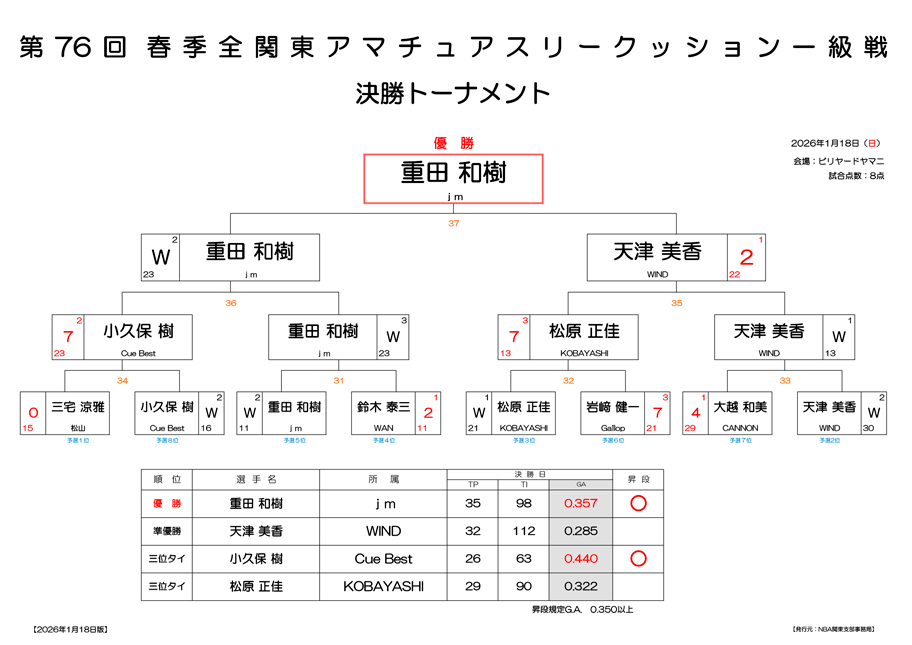第76回 春季 全関東アマチュアスリークッション一級戦 試合結果です
