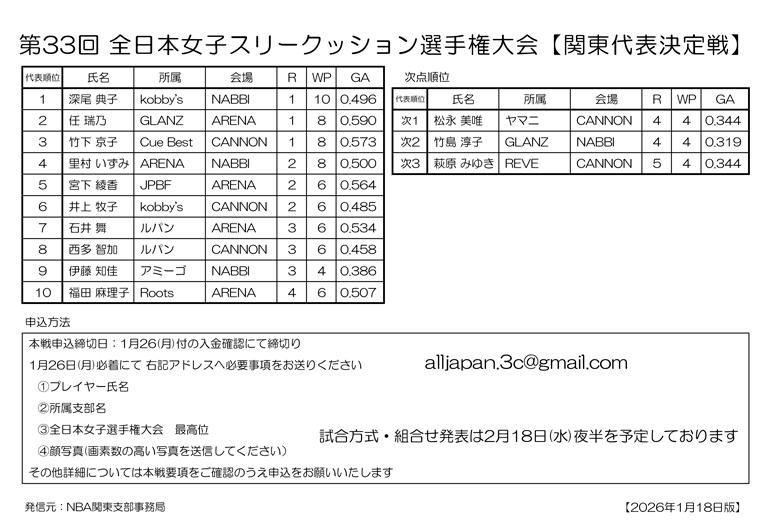 第33回 全日本女子スリークッション選手権大会 関東代表決定戦 組合せです
