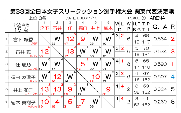 第33回 全日本女子スリークッション選手権大会 関東代表決定戦 試合結果と代表選手一覧です