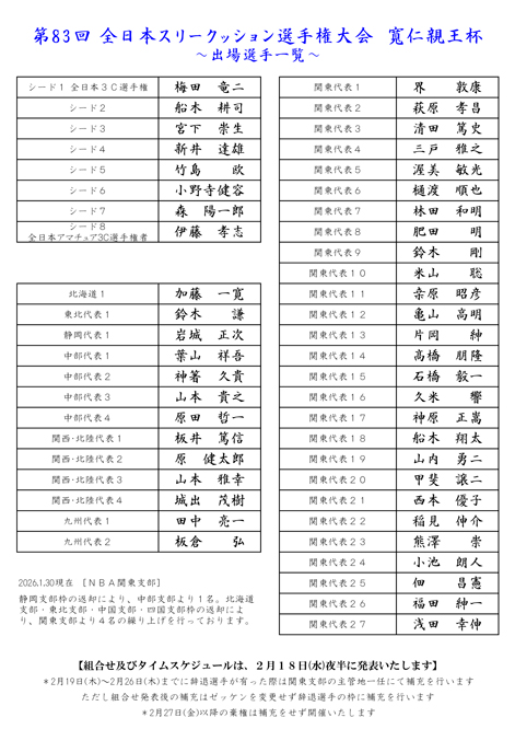 第83回全日本スリークッション選手権大会 出場選手一覧/第33回全日本女子スリークッション選手権大会 出場選手一覧です
