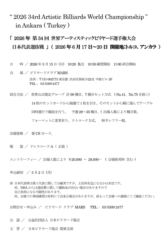第34回 世界アーティスティックビリヤード選手権大会 日本代表選抜戦 大会要項です