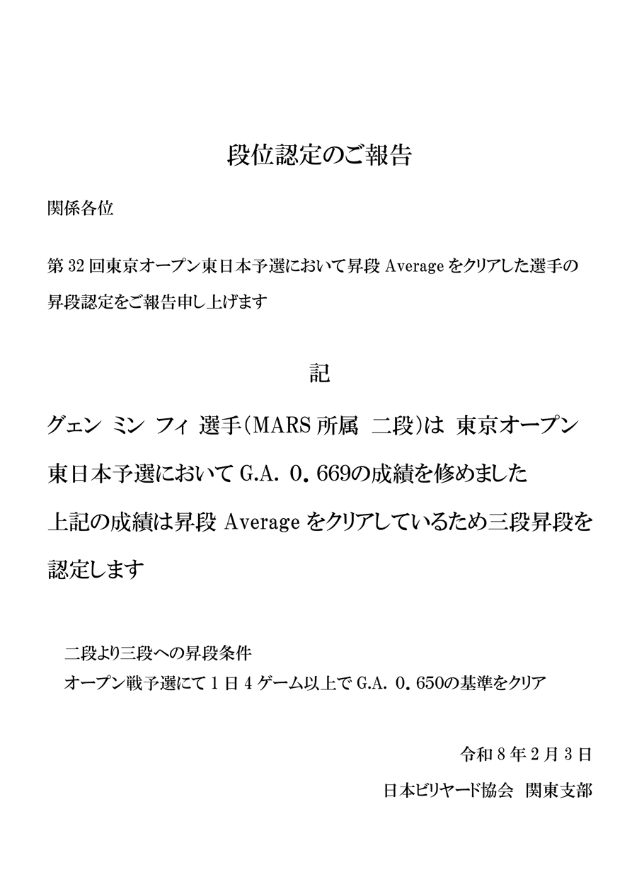 【昇段認定】東京オープン東日本予選会において 昇段基準をクリアした選手の報告です