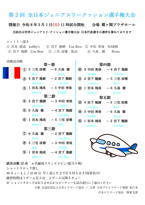 第2回 全日本ジュニアスリークッション選手権大会 選手リストと試合スケジュールです